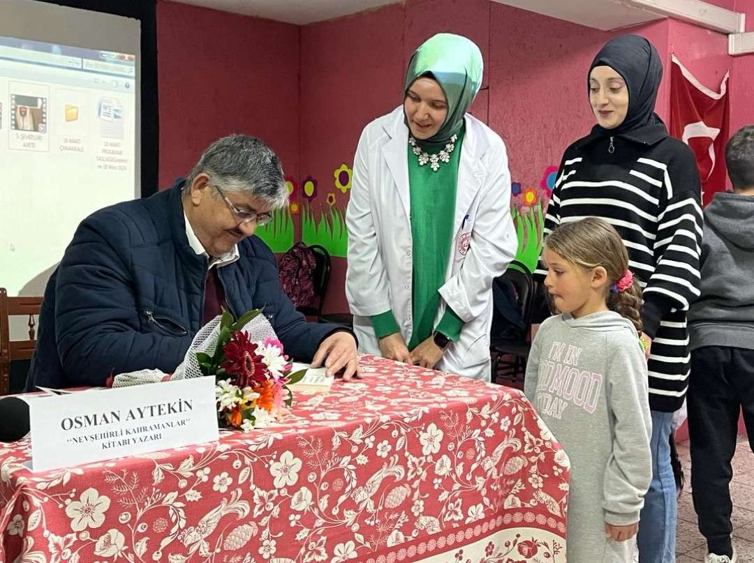 Derslerle ve mesajlarla dolu doğaçlama gelişen skecin sonunda da "Nevşehirli Kahramanlar" kitabı yazarı Osman Aytekin, Vatan Bakkalı ziyaret ederek öğrencilere güzel bir sürpriz yaptı. Hem öğrenciler için tek tek kitabını imzaladı hem de harika bir "yazar söyleşisi"nde bulundu. Öğrencilerin yazarımıza soruları, Nevşehirli Kahramanlar Harp Hikayeleri isimli kitaptan kelime sorma yarışmaları ile program zenginleşti ve renklendi. Şehitlerimizin ruhuna dualar ve ikramlar ile de etkinliklerimiz sona erdi. Emeği geçen idarecilerimizi, okulumuzun tüm öğretmenlerini ve Yazar Osman Aytekin'i tebrik ediyoruz.