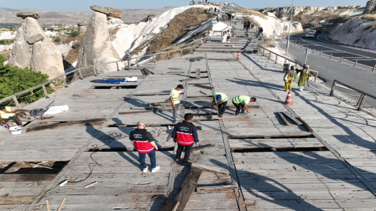 Aslına uygun şekilde onarılan yürüyüş ve seyir alanındaki eski travers döşemeler, yerli ve yabancı misafirlerimizin Kapadokya'nın eşsiz manzaralarını güvenli bir şekilde keşfetmelerine olanak sağlayacak şekilde yenileniyor" denildi