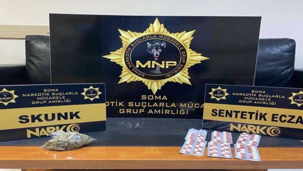 Manisa İl Emniyet Müdürlüğü Narkotik Suçlarla Mücadele Şube Müdürlüğü Soma Büro Amirliği görevlilerince uyuşturucu veya uyarıcı madde ticareti yapan, nakleden ve kullanan şahıslara yönelik yapılan çalışmalarda Soma’da durdurulan bir araçta yapılan aramada; 24 gram skunk maddesi, 77 adet sentetik ecza hapı ele geçirildi. Konuyla ilgili E.E. (24) ve K.T. (24) isimli 2 şüpheli uyuşturucu veya uyarıcı madde imal ve ticareti yapmak suçundan gözaltına alındı. Emniyetteki işlemlerinin ardından 2 şahıs da sevk edildikleri adli makamlarca tutuklandı.