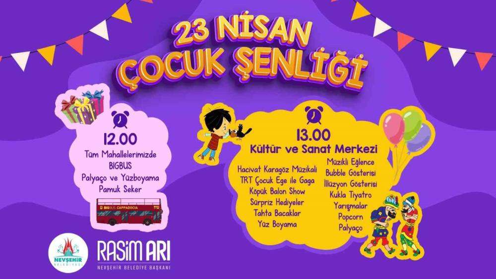 Nevşehir Belediyesi tarafından 23 Nisan Ulusal Egemenlik ve Çocuk Bayramı dolayısıyla hazırlanan etkinliklerle çocuklar bayram coşkusunu doyasıya yaşayacak.