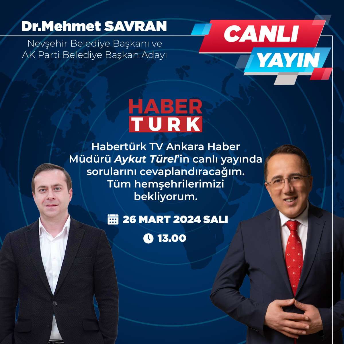 Nevşehir Belediye Başkanı ve AK Parti Nevşehir Belediye Başkan Adayı Dr. Mehmet Savran, 26 Mart Salı günü Habertürk ekranlarında olacak.