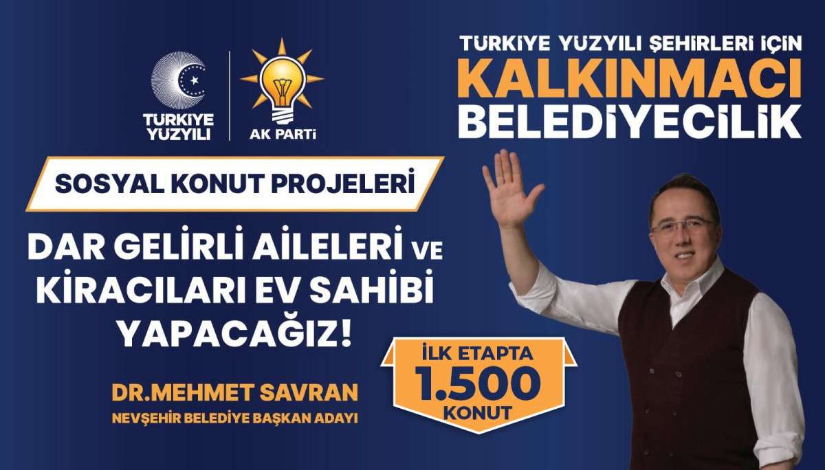 AK Parti Belediye Başkan Adayı Dr. Mehmet Savran, Sosyal Konut Projesi ile Nevşehir’deki başta dar gelirliler olmak üzere 1500 kiracı aileyi uygun fiyat ve ödeme koşullarıyla ev sahibi yapacaklarını söyledi. Savran, proje için başvuruların Nisan ayında başlayacağını açıkladı.