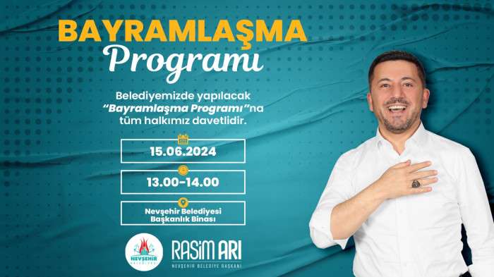 Nevşehir Belediyesi’ndeki bayramlaşma programı 15 Haziran 2024 Cumartesi günü 13.00-14.00 saatleri arasında başkanlık binasında gerçekleştirilecek. Başkanlık makamında vatandaşları konuk edecek olan Belediye Başkanı Rasim Arı, hemşehrileri ile burada bayramlaşarak sohbet edecek.