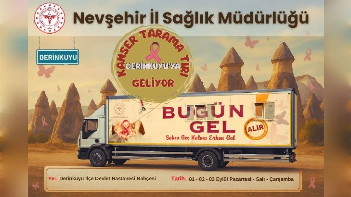 Kanser Tarama Tırı Derinkuyu'a Geliyor! Erken teşhis hayat kurtarır! Kanser tarama tırımız, 01 Eylül 2025 Pazartesi, 02 Eylül 2025 Salı, 03 Eylül 2025 Çarşamba tarihlerinde Derinkuyu İlçe Devlet Hastanesi Bahçesinde hizmet verecektir.