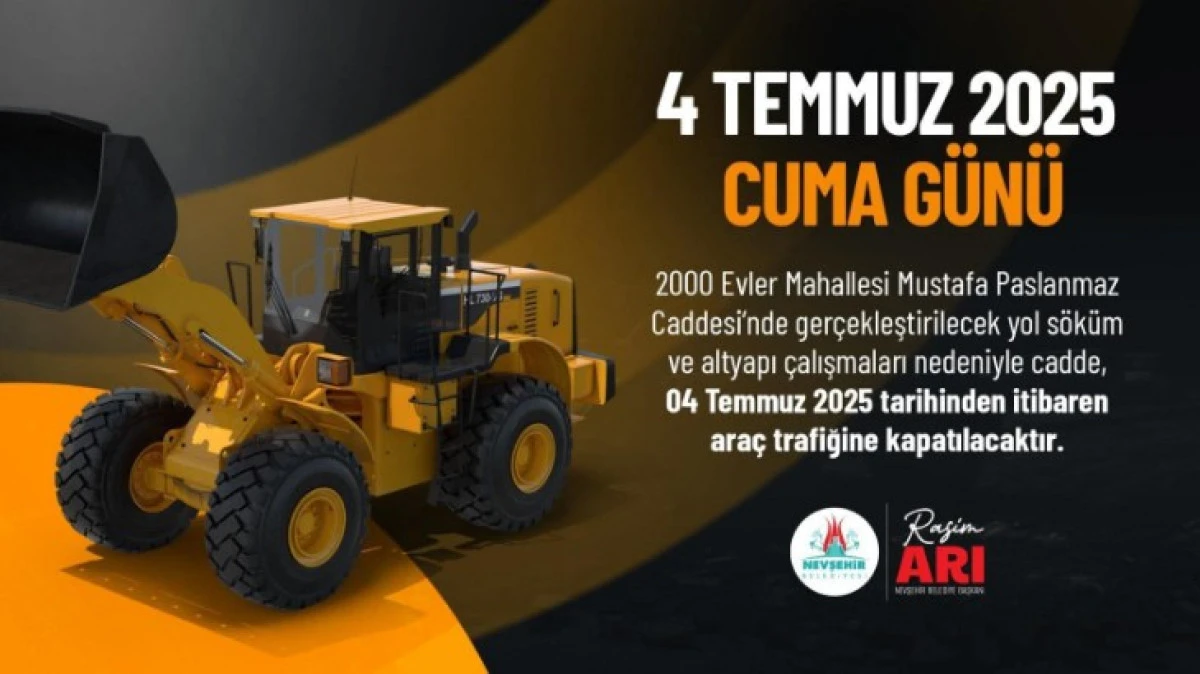 04 Temmuz 2025 Cuma günü saat 08.00’de 2000 Evler Mahallesi Mustafa Paslanmaz Caddesi’nde yol söküm ve altyapı çalışması yapılacağından söz konusu alanın tamamına araç park edilmemesi ifade edildi.