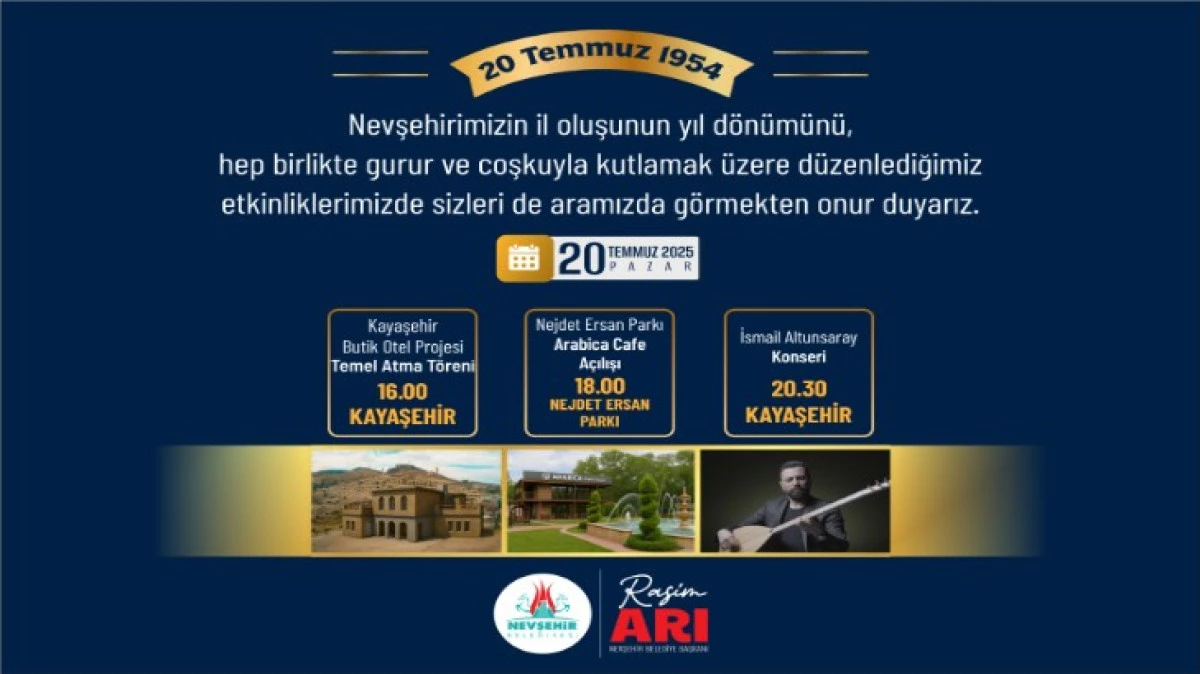 Nevşehir Belediye Başkanı Rasim Arı yaptığı açıklamada “20 Temmuz 2025 Pazar günü Nevşehir’imizin il oluşunun yıldönümünü, hep birlikte gurur ve coşkuyla kutlamak üzere düzenlenecek etkinlik ve açılışlarımıza siz kıymetli bütün vatandaşlarımızı davet ediyorum.” diye konuştu.