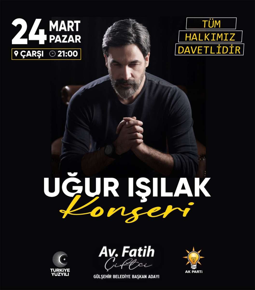 Gülşehir Belediye Başkanı AK Parti Belediye Başkan Adayı Fatih Çiftçi, 24 Mart Pazar günü Gülşehir’de Uğur Işılak konseri düzenliyor.