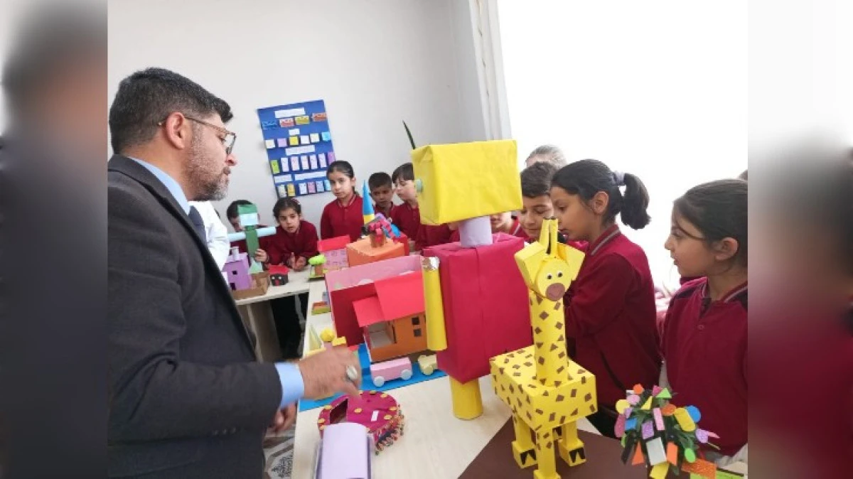 Etkinliğe katılım sağlayanlar, öğrencilerin dikdörtgenler prizması, kare prizma gibi geometrik şekillerle hazırladıkları çalışmaları yerinde inceledi. Minik öğrencilerin yaptıkları maketleri anlatırken konuyu kavradıkları gözlemlendi.