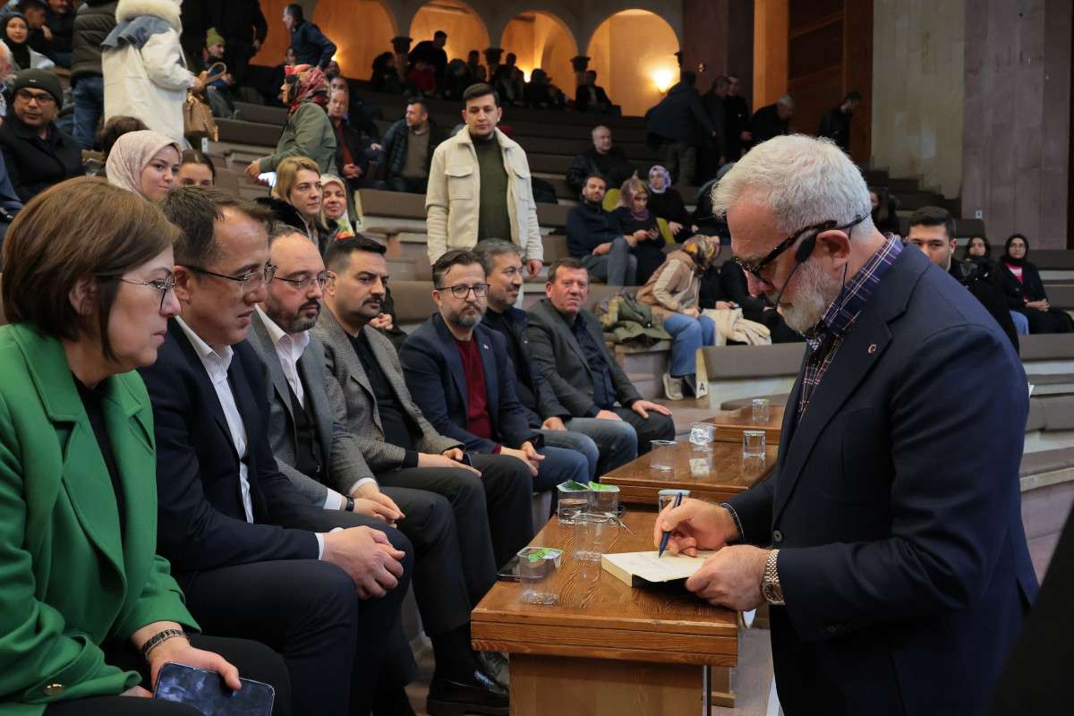 Yenişehirlioğlu, konuşmasının ardından okuyucuları için kitaplarını imzalayarak katılımcılarla fotoğraf çektirdi.