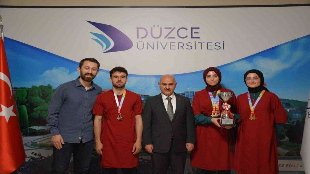 Ünilig Fetih Spor Fest 2023 müsabakalarında üniversiteler arası Geleneksel Türk Okçuluğu Yarışmasında şampiyon olan Düzce Üniversitesi öğrencileri, sevinçlerini Rektör Prof. Dr. Nedim Sözbir ile paylaştı.
