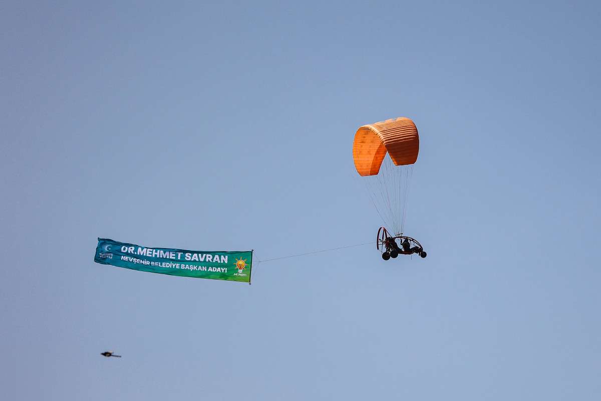 AK Parti Nevşehir Belediye Başkan Adayı Dr. Mehmet Savran’ın seçim afişi paramotorla şehrin üzerinde uçuruldu. Bu gösteri, seçim atmosferine yeni bir soluk getirdi.