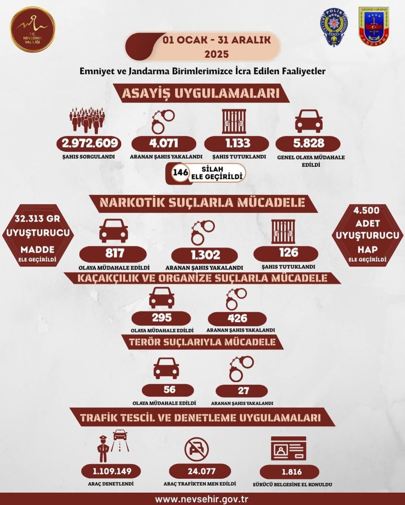 Nevşehir Valiliği, emniyet ve jandarma teşkilatlarının koordineli çalışmalarıyla suç ve suçlularla mücadelenin kararlılıkla sürdürüldüğünü, denetim ve uygulamaların 2026 yılında da artarak devam edeceğini bildirdi.